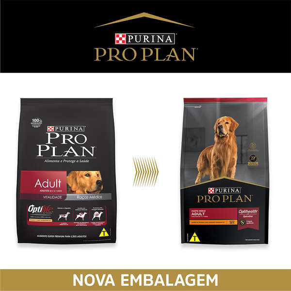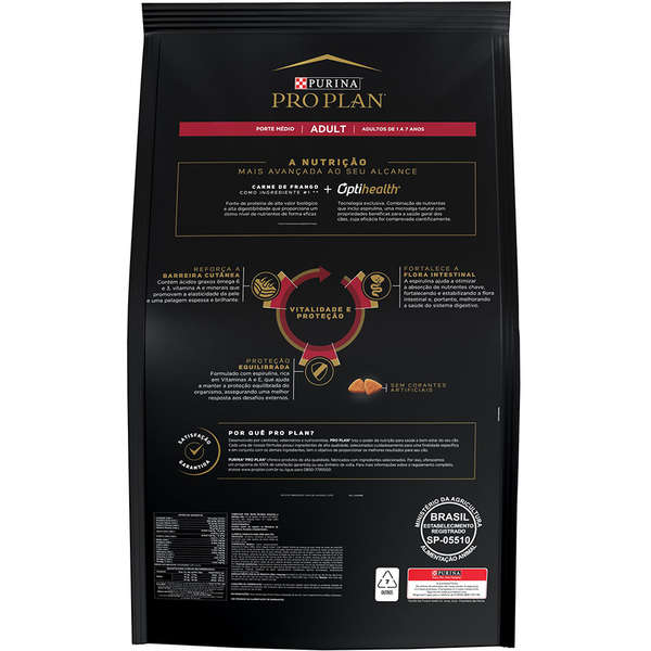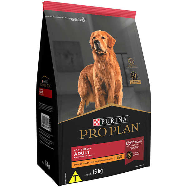 A Ração Seca Nestlé Purina Pro Plan Frango Cães Adultos Raças Médias com OptiHealth® satisfaz as necessidades metabólicas dos cães adultos de diferentes portes. Inclui um conteúdo rico em proteínas de alta qualidade, como as da carne de frango, para ajudar a manter a massa corporal magra, além de uma combinação de nutrientes que inclui espirulina, uma microalga natural com propriedades benéficas para a saúde geral dos cães, cuja eficácia foi comprovada cientificamente.